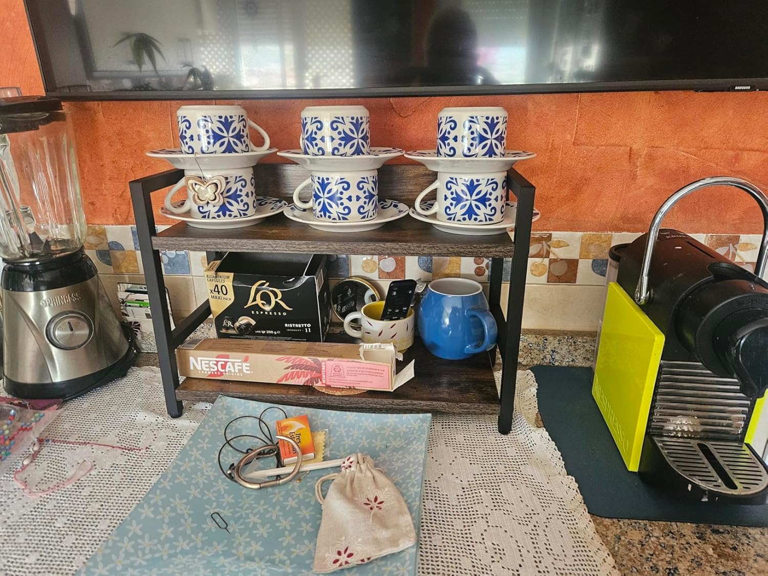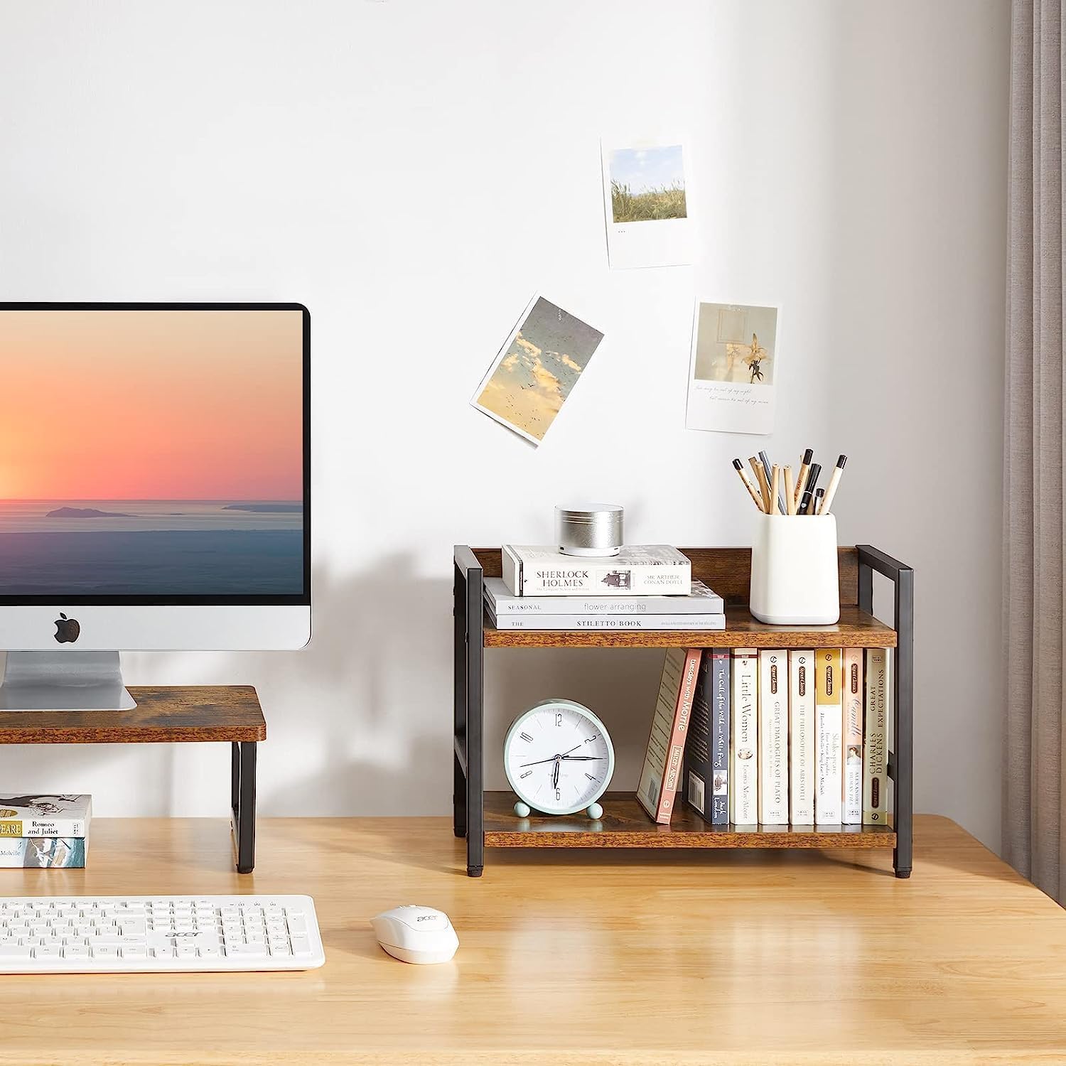2-Tier Industrial Storage Shelf, Rustic Brown Wood with Black Metal Frame